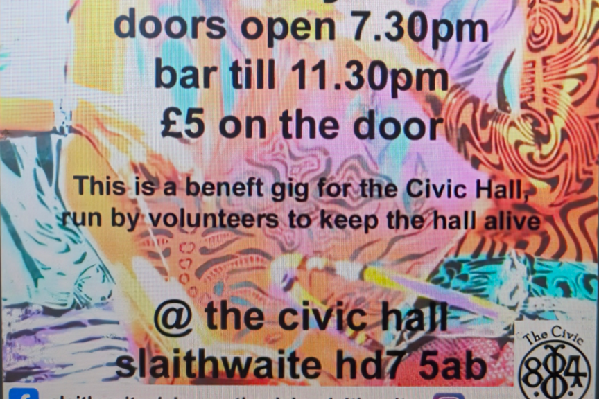 By the Worlds Collide Music CollectiveAt the Civic Hall Slaithwaite - bar until 11:30pm£5 on the doorThis is a benefit gig for the Civic Hall run by volunteers to keep the hall alive